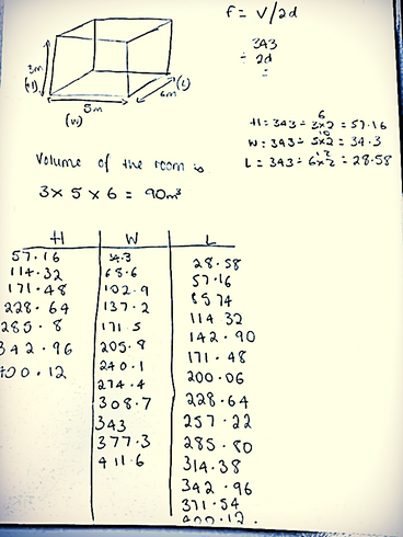 This is the really complicating bit. This is where you take everything you worked out before. And then use that information to work out the reverberation time of the room. This is done by working out the surface area of each dimension, meaning the walls and the floor and ceiling. Whereas before I didn’t have the window and door, I now have to deduct the window and the door from the surface area of two walls. Then after you have done all of this you will need to add up all of the ending calculations of the walls surfaces. And then use the equation on the top of the sheet and divide the answer from 0.161 x 90 which is 14.49 by the surface area x absorption time added together which is 24.87. You divide these and that comes up with the answer for the reverberation time. Reverberation time is where the length of reverb lasts. Reverb is basically echo. You can change this. If you are in a small room it won’t be very echoy, whereas if you are in a massive theatre and it is king of bare the sound will bounce around everywhere off of everything and that is called reverb/echo.